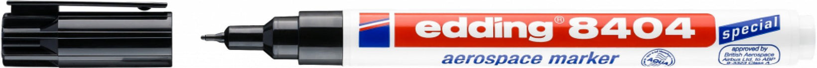 El marcador Edding 8404 con tinta de bajo corrosión escribe en casi todas las superficies y se utiliza principalmente en materiales metálicos. Está fabricado especialmente para la industria aeronáutica, automotriz y para la fabricación de metales. También escribe bien en objetos de plástico y goma.