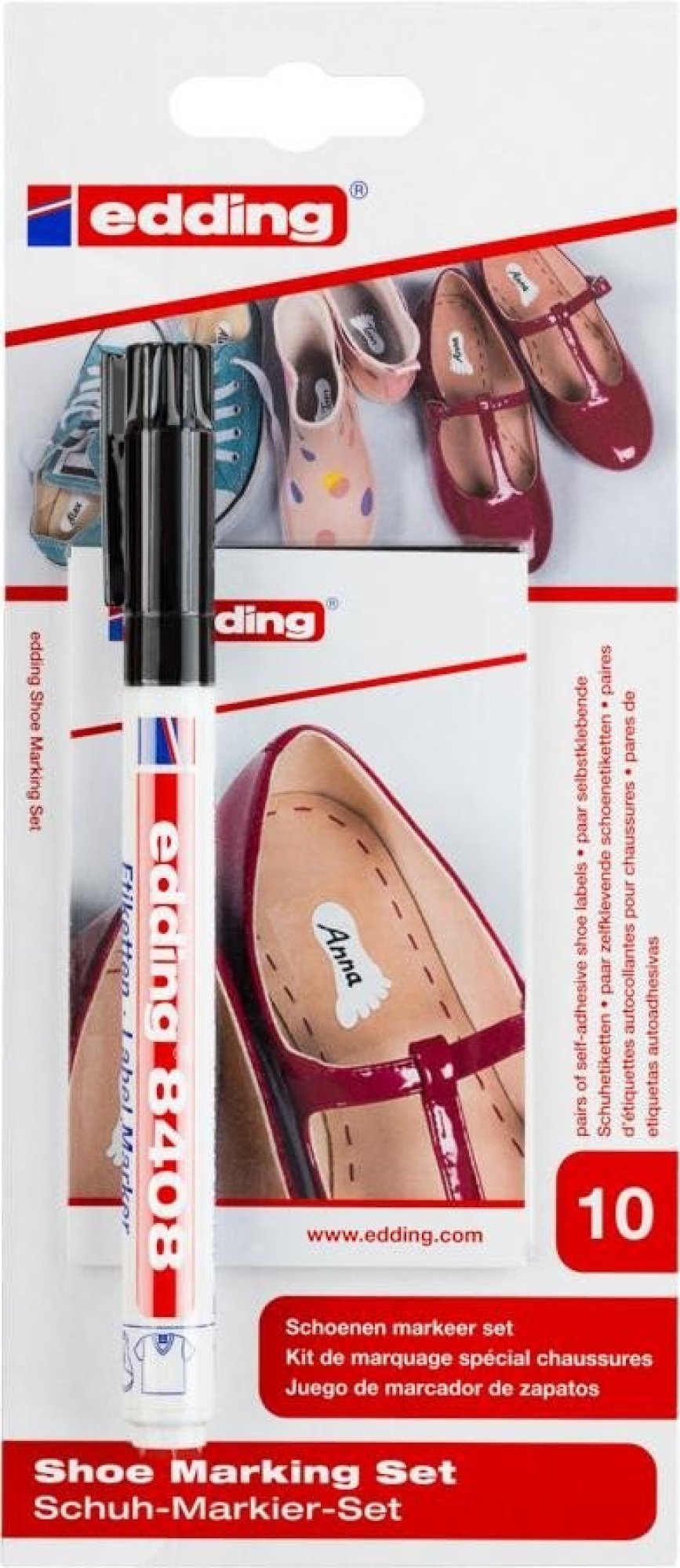 ¿Cómo firmar zapatos para el jardín de infancia, la escuela o el deporte? Pruebe el marcador permanente negro de la marca Edding. Para una etiquetado visualmente atractivo de los zapatos se incluye también etiquetas que se colocan dentro del zapato.