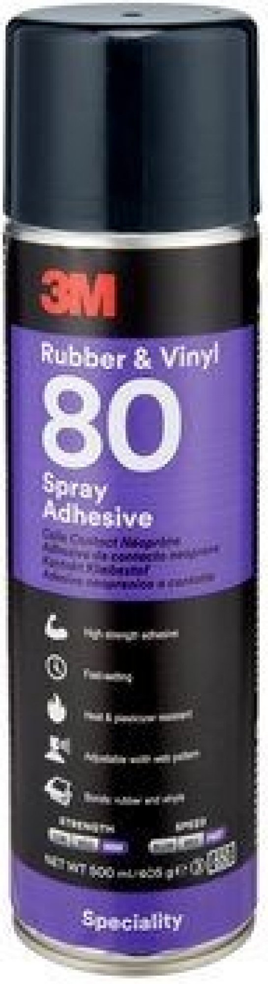 Adhesivo de contacto de alta resistencia y rápida adherencia 3M Scotch-Weld 80 de color amarillo, crea uniones fuertes, duraderas y resistentes de diversos materiales, principalmente cauchos flexibles y PVC. Tiene alta resistencia a la temperatura. El sistema de pulverización lineal controlada asegura una aplicación precisa. Alto contenido de sólidos.