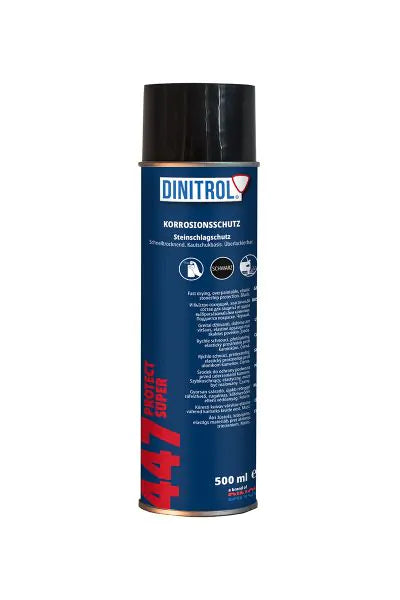 DINITROL 447 SPRAY Protect Super se aplica uniformemente en una capa cruzada sobre la superficie a una presión de aire de 4 - 6 bares utilizando una pistola de protección de chasis comúnmente disponible. Las manchas se pueden eliminar con un paño empapado en gasolina.