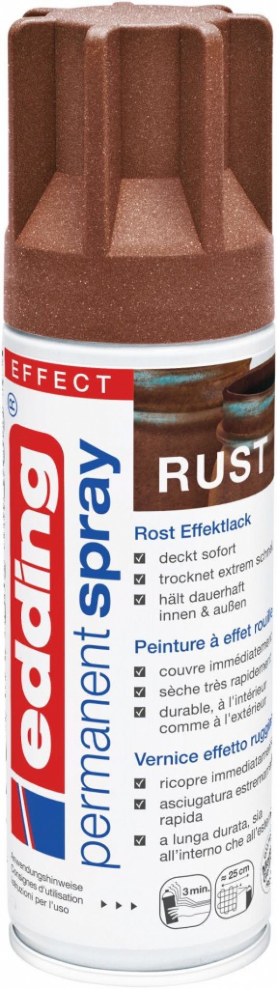 Pintura permanente de alta calidad Edding 5200 con textura rugosa y apariencia visual de óxido con extraordinaria capacidad de cobertura, se seca extremadamente rápido y es duradera incluso en exteriores.
