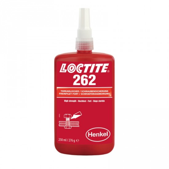 El fijador de roscas Loctite 262 fija de manera permanente y, sobre todo, sella las uniones roscadas. Este fijador de uniones roscadas de resistencia media previene el aflojamiento de la rosca una vez curado. Loctite 262 se cura en la unión de la rosca entre dos superficies metálicas, y sin acceso al aire. Una vez completamente curado, asegura un ajuste de resistencia media del tornillo en la rosca. Loctite 262 es resistente a vibraciones, golpes y otros movimientos mecánicos que no benefician a las roscas. Entre las aplicaciones específicas se incluye el aseguramiento y sellado de tornillos en un perno. Una gran ventaja es la naturaleza tixotrópica, que evita que Loctite 262 gotee del lugar de aplicación.