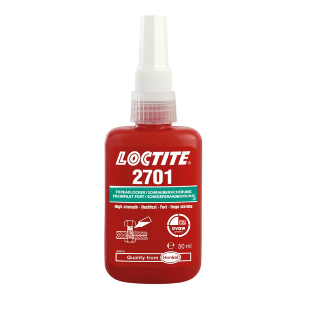 El fijador de uniones roscadas de alta resistencia Loctite 2701 se utiliza donde se necesita asegurar fuertemente las uniones. Loctite 2701 se cura sin acceso al aire en la unión entre dos superficies metálicas, y una vez curado es muy resistente y evita el agrietamiento de la unión y el posterior desprendimiento de las partes pegadas o su aflojamiento. Sin embargo, la desventaja es que Loctite 2701 no se puede desmontar más, por ejemplo, para el mantenimiento regular. Una vez que se cura, el desmontaje de las partes será muy laborioso. Por lo tanto, es ideal para aplicaciones permanentes, como en pernos de bloque de motor apretados permanentemente, diversas carcasas de motores eléctricos, etc.