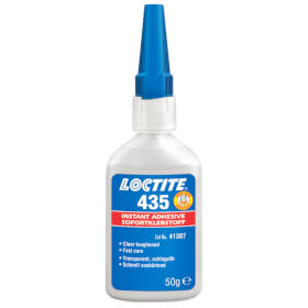 El adhesivo Loctite 435 une rápidamente muchos materiales, como metales, plásticos y elastómeros. También es adecuado para pegar materiales absorbentes y porosos, como madera, tela, cuero o papel.