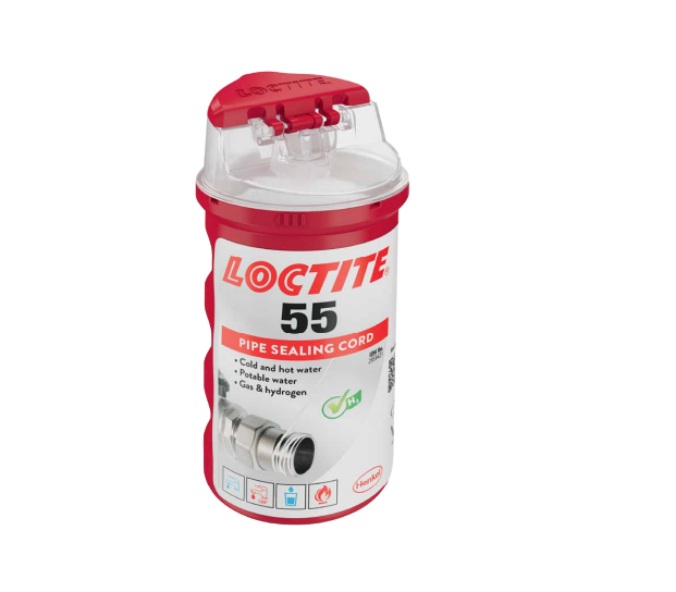 El sellador de roscas universal Loctite 55 está fabricado en forma de cordón enrollable. La aplicación es muy fácil y rápida, el hilo se enrolla directamente desde el envase plástico, en el que se puede seguir almacenando el sellador Loctite 55 después de la aplicación. Se recomienda utilizar el hilo sellador para asegurar y sellar principalmente tubos o accesorios metálicos o plásticos, hasta un tamaño de 6" NPT. Esta solución es óptima para conjuntos roscados donde se requiere un uso inmediato. Una gran ventaja de los cordones selladores como Loctite 55 es que no curan y sellan inmediatamente después de la aplicación, incluso bajo presión máxima.