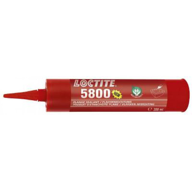 Loctite 5800 es un sellador monocomponente para el sellado de juntas de bridas metálicas. Apto para metales, la junta es de color rojo y sella inmediatamente la junta a bajas presiones. Presenta una excelente resistencia química y térmica (de -55 a +180 °C). Incluye una ficha de datos de seguridad blanca; no contiene sustancias peligrosas.