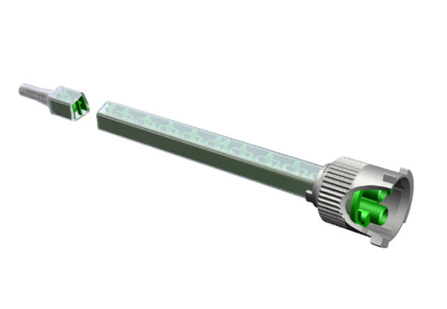 MBQ 05-16L es un mezclador estático para cartuchos dobles, generalmente de adhesivos epóxicos de 50 ml. Se coloca directamente en el cartucho de dos componentes. El adhesivo se mezcla dentro del mezclador y, al salir, está perfectamente preparado para su aplicación.
