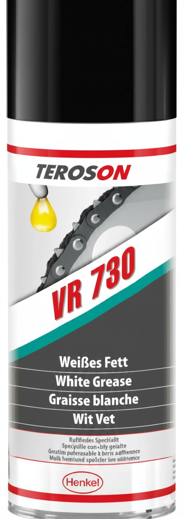 Teroson VR 730 es un aerosol lubricante blanco utilizado para lubricar mecanismos abiertos, engranajes, cadenas y acopladores. Muy adecuado para lubricar las puertas y los cilindros de los vehículos. En las zonas de fuga, forma burbujas; es no tóxico y no inflamable.